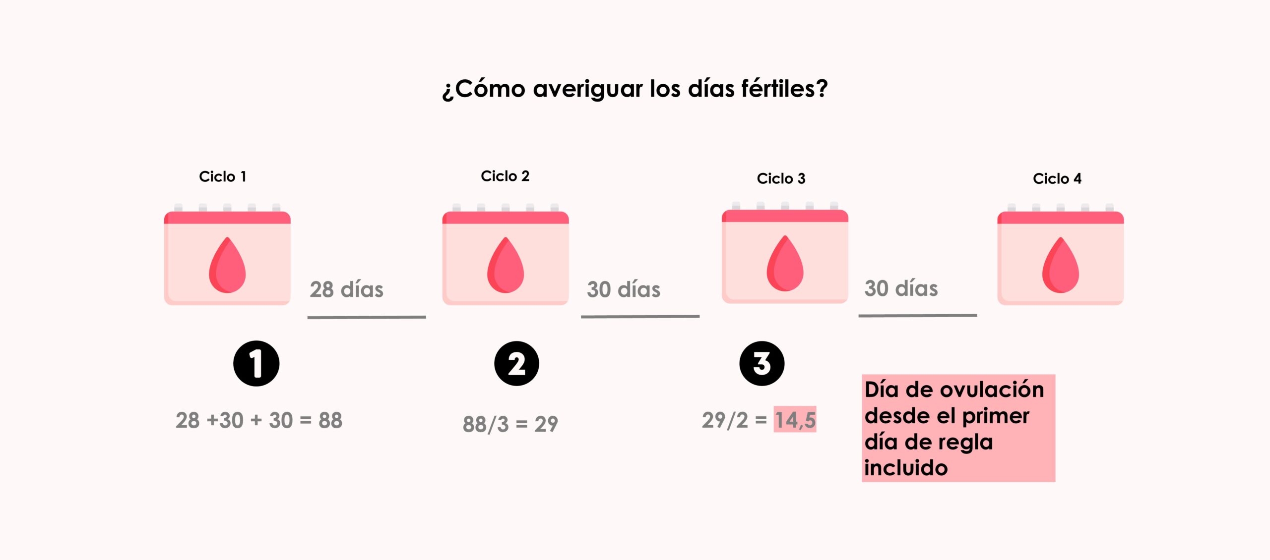 Lo ejemplificamos con cifras: en la mujer de nuestro ejemplo, transcurren 28, 30 y 30 días entre el primer día de sus reglas. Los sumamos (28+30+30=88). La cifra resultante la dividimos entre 3 (88/3=29,33). Por lo tanto, la mujer tiene un ciclo ovulatorio que le dura de media 29 días. Estos 29 días los dividimos entre dos (29/2=14,5). Es decir, en este ejemplo, la mujer ovularía a los 14 días de tener su 1º día menstrual.