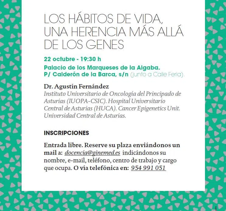 ¿Sabías que el estilo de vida que llevó tu abuelo podría afectar a tu fertilidad? En esta nueva conferencia de I+D+i el Dr. Agustín Fernández, Instituto Universitario de Oncología del Principado de Asturias (IUOPA-CSIC). Hospital Universitario Central de Asturias (HUCA), hablará precisamente de la importancia de los malos hábitos de vida en la salud de nuestros descendientes, una herencia nada deseable.