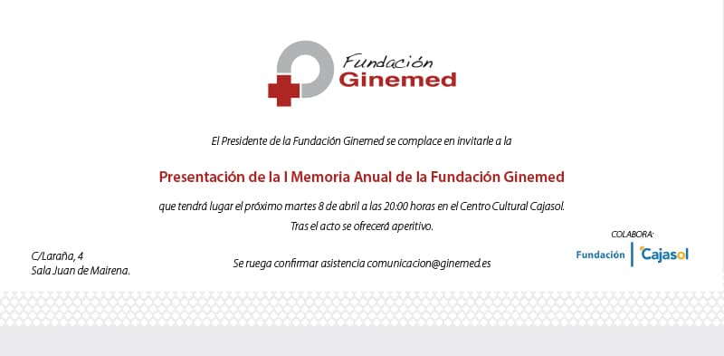 El próximo martes 8 de abril, la Fundación Ginemed tendrá el placer de compartir con todos sus colaboradores, amigos y personal de Ginemed Clínicas, la presentación de su I Memoria Anual. El acto se celebrará en el Centro Cultural Cajasol a las 20:00 horas. En esta primera memoria se recogen las iniciativas, los proyectos, los datos de rendimiento y los logros obtenidos por la Fundación. De esta forma, y mediante un acto bien organizado queremos mostraros el trabajo responsable de todo un año.